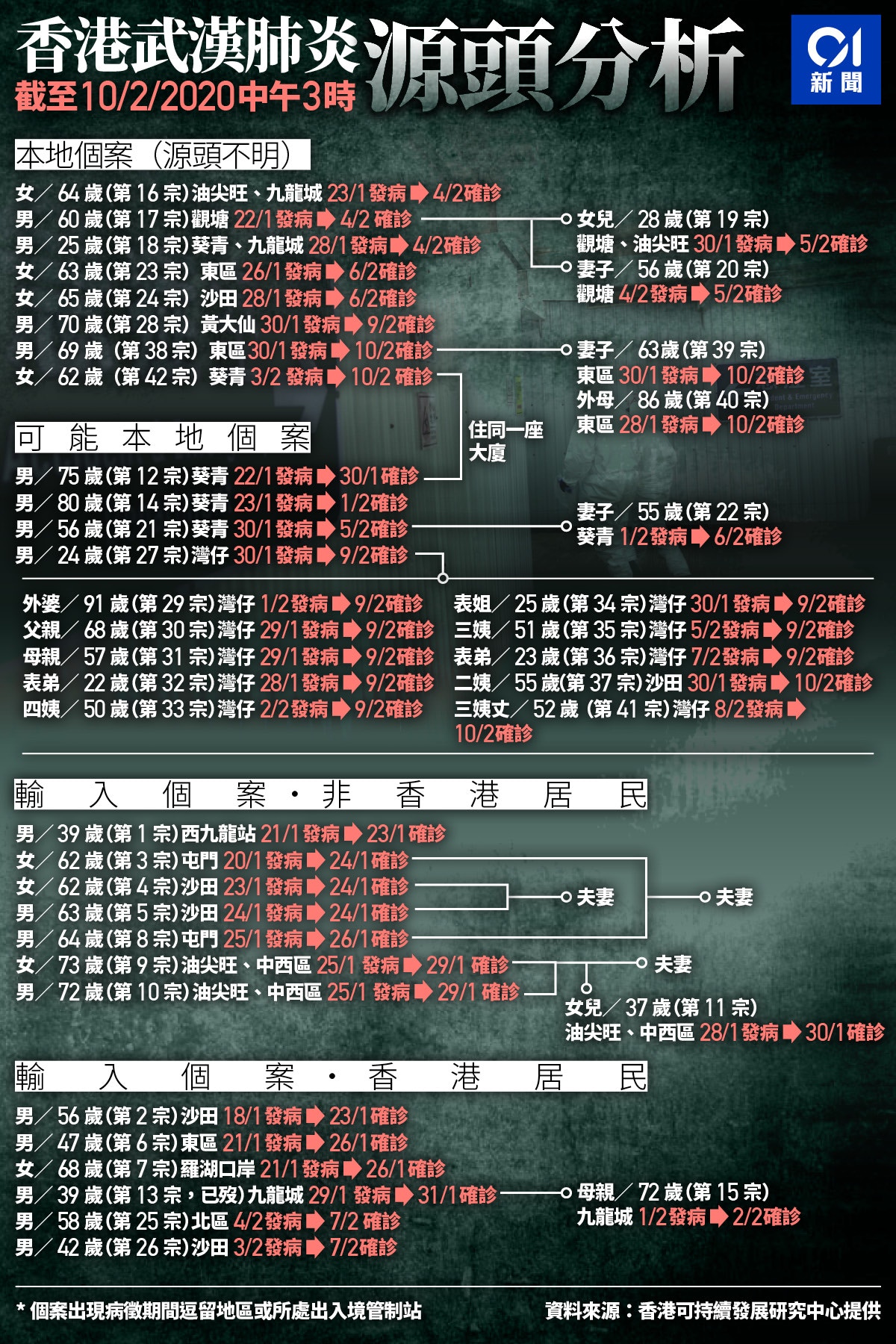 Jun 16, 2021 · 彰化、南投、雲林三個縣,16日好消息,都是 0,台中市則新增1例,是名27歲的業務員,他是龍井區家庭群聚案的鄰居,5月23日曾跟確診的婆婆. Jun 02, 2021 · 案9148的狀況。(新竹縣政府提供) 楊文科表示,案9148為先前確診個案4733的同住家人,5月24日匡列者隔離採檢,當時為陰性,不過該個案5月30日開始. May 24, 2021 · 嘉義市昨天出現首例確診個案,今天並無新增,不過市長黃敏惠表示,新北市確診的案4464、案4645,本月15日起到嘉市的活. May 15, 2021 · 健康百科, 新冠頭條, 即時新聞, 新冠肺炎, 傳染疾病 疫情即時/180 例確診個案分散於 7 個縣市!案 1289 曾搭乘台鐵普悠瑪回台南 May 24, 2021 · 看房真的是全民運動?本土疫情爆發,15日雙北市進入第三級警戒,全國則在19日提升至三級警戒,不過,由後來公布的確診者足跡,就有幾個「夯建. Jun 17, 2021 · 雲林縣17日無新增確診個案,但有外縣市確診至本縣足跡案1例(案13619),為男性21歲,平時於雲林縣麥寮鄉六輕工業區上班,11日返回桃園住家,曾. Jun 26, 2021 · (更新:新增衛生局回應) 高雄本月23日公布的仁武群聚案的指標個案、案14359,由高市自行疫調,才發現是來自新北市恩主公醫院群聚, 讓高雄市長陳其邁震怒,批自始至終未接獲通報,繼而引發防疫團隊與醫院隔空交鋒,其中恩主公醫院護理部主任詹碧端,為悍衛院譽發公開信,直指南部這起群. May 30, 2021 · 新竹縣今天0確診,新竹縣長楊文科表示,針對近日洗腎中心案件35名相關接觸者,衛生局已進行第2次採檢,結果均為陰性,待. Jun 05, 2021 · 全台今(5)日新增476例本土病例,確診者集中在雙北地區,高雄市則增加3例個案,包含2起家庭群聚感染。其中小港區家庭群聚案為丈夫傳染給同住.